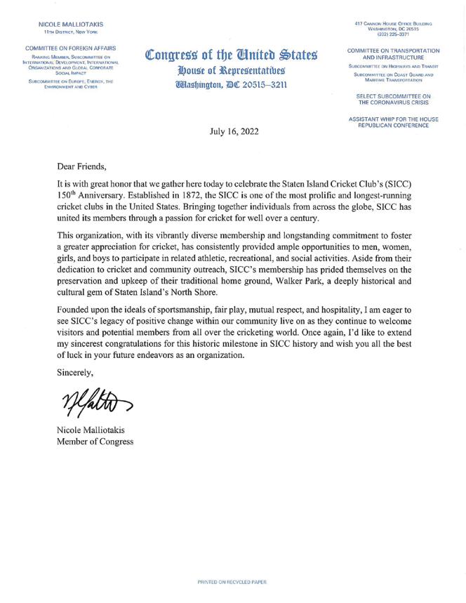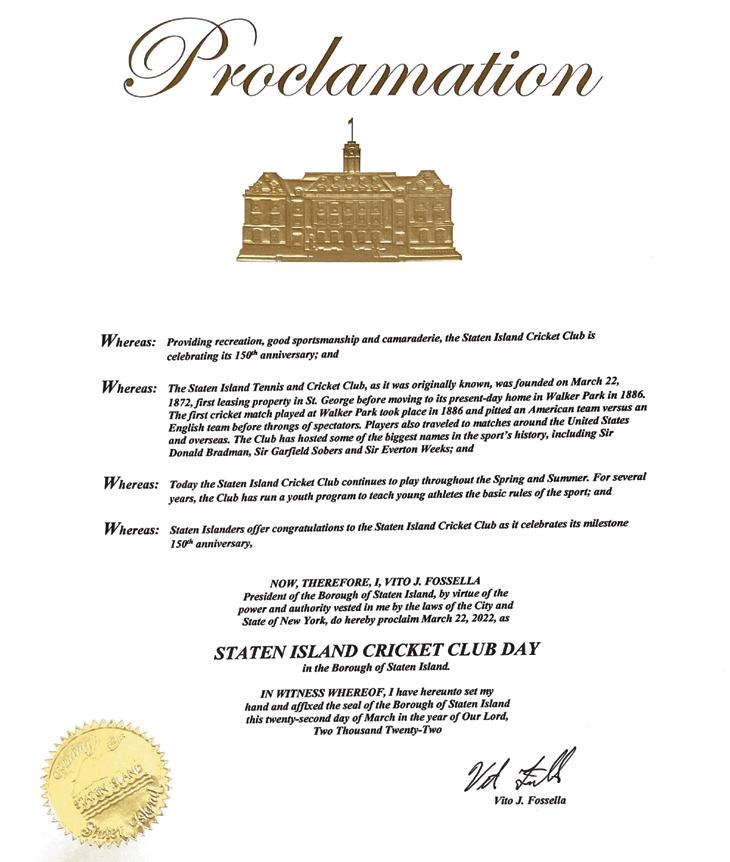 would like to congratulate Staten Island Cricket Club on 150 years.