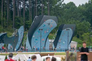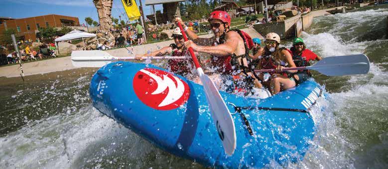 For thrill-seekers looking for an immersive experience, Whitewater’s manmade recirculating river utilizes a conveyor belt that continuously loops back to the start, allowing rafters to engage in a series of highly concentrated Class II-IV whitewater rapids—an exhilarating experience like no other! Safety is paramount, of course. Therefore, all rafts are guided by a Whitewater guide, and guests are equipped with helmets, paddles, and personal flotation devices. Before embarking on a group trip, guests and their guides must partake in an informative talk session followed by an instructional brief in their raft, ensuring everyone is prepared for their whitewater excursion. Whitewater offers a variety of rafting styles to fit different groups’ choices and comfort levels; there’s Family Rafting, an introductory experience down Class II-III rapids on the Wilderness Channel; Adventure Rafting, a fasterpaced challenge through continuous Class IIIIV rapids on the Wilderness and Competition Channels; Big Water Sessions, a high-intensity experience on the Wilderness and Competition Channels, with double the water flow; and Rodeo Rafting, a more intimate experience where participants paddle in a smaller raft that contains up to four guests per guide.