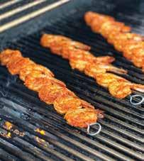 8. Grill the shrimp on both sides until fully cooked, about 2-3 minutes per side. Remove the shrimp from the skewers into a bowl, and squeeze on some lemon juice.
