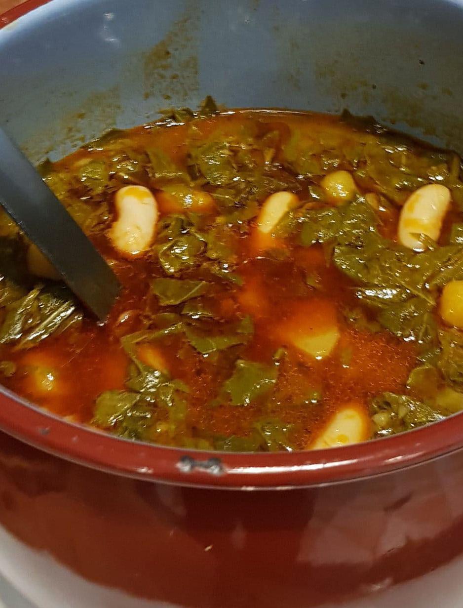 Tras una breve cocción en agua (que se retira) cuece en nueva agua junto con patatas escachadas y el compango que, en nuestro caso, es siempre chorizo, morcilla y costilla adobada.