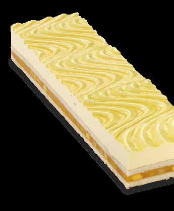 Subtle combination of exotic flavours, mango and passion fruit. Textured dessert: soft almond sponge cake, light mousse, melting fruit confit and crunchy pineapple inserts. Easy-toportion dessert in 8/10 servings. Thaw for 4 hrs in the refrigerator.