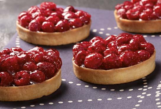 Crème d'amandes, gelée de framboises et groseilles - Fond de tarte au beurre recouverte de framboises entières. Décongeler 4 h au réfrigérateur.
