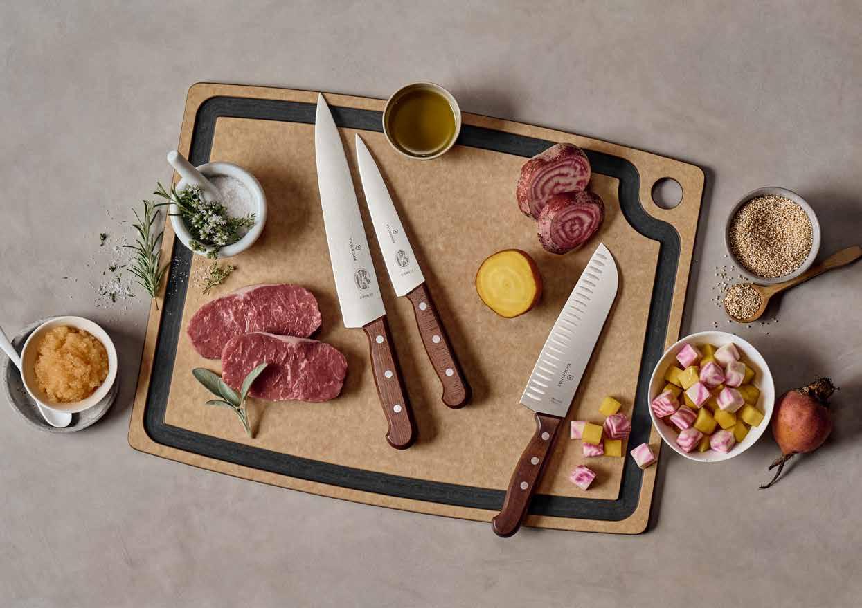 Die Victorinox Wood Kollektion kombiniert extra scharfe rostfreie Stahlklingen mit ergonomischen Griffen mit wunderschönem, widerstandsfähigem und natürlichem Holz-Finish. Holz ist äusserst robust und verleiht jedem Messer einen einzigartigen, markanten Look. Das Sortiment umfasst eine Reihe von eleganten Messern für jede Küchenaufgabe, vom Kuchenbacken bis zum Tranchieren. Treffen Sie die Wahl zwischen breiten und schmalen Klingen mit gerader oder gebogener Schneide oder sogar Santokumessern. Es liegt ganz bei Ihnen.