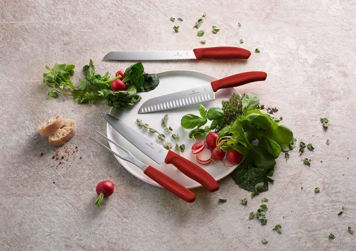 Bei der Entwicklung der Victorinox Swiss Classic Kollektion wurde keine noch so kleine oder grosse Küchenaufgabe ausser Acht gelassen. Die in der Schweiz gefertigten Messer aus hochwertigem rostfreiem Stahl liegen leicht in der Hand und sind spülmaschinengeeignet. Die Swiss Classic Kollektion verleiht Ihrer Küche mit ihren bunten Griffen einen frischen Farbtupfer. Die Freude an der Funktionalität macht dieses Sortiment aus, zu dem auch praktische Messerblöcke und Geschenksets gehören. Eine vielseitige Kollektion, die alle Küchenaufgaben mit auffallendem Stil meistert.