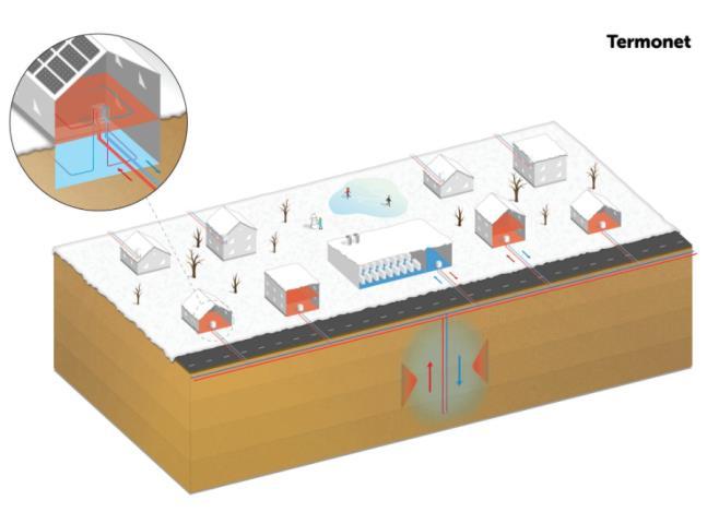 - I termonet med jordvarme ligger temperaturen i brinen på omkring 10 °C Det har den fordel at det giver mulighed for frikøling om sommeren, hvorved jorden ”genoplades” med varme. Hvis bebyggelsen / landsbyen har en rimelig tæt karakter, er det også oplagt at overveje en fjernvarmeløsning. Det kan være relevant i mange områder hvor der i dag er forsyning med naturgas. Termonet har to fordele til sammenligning med traditionel fjernvarme: