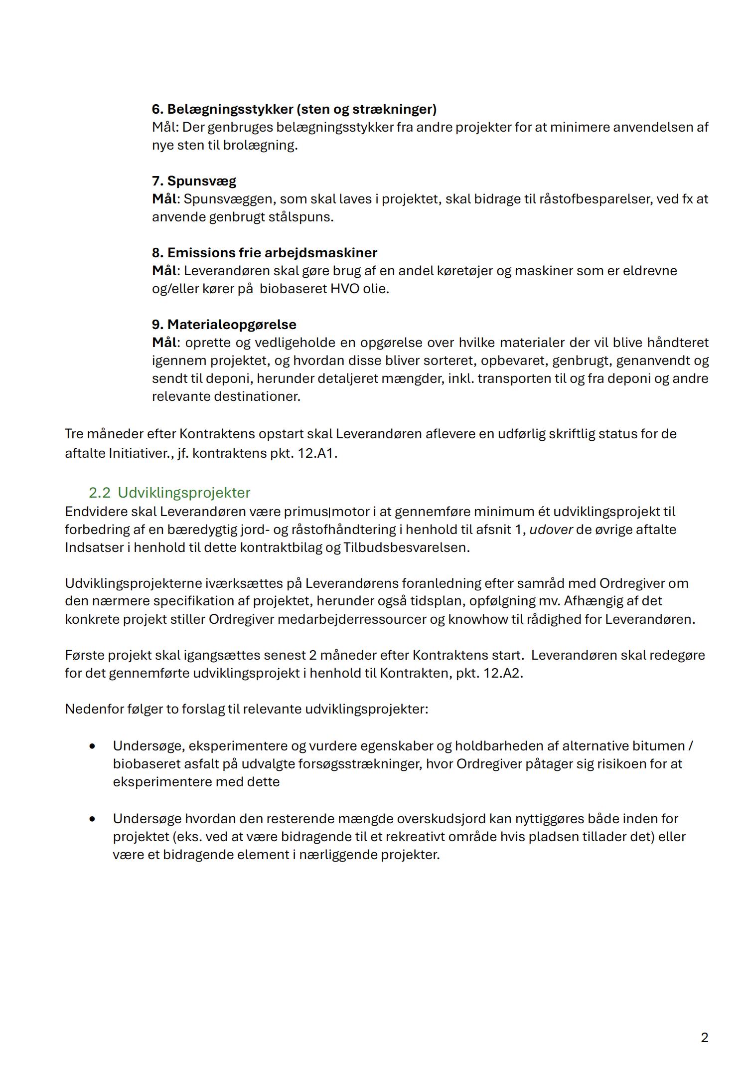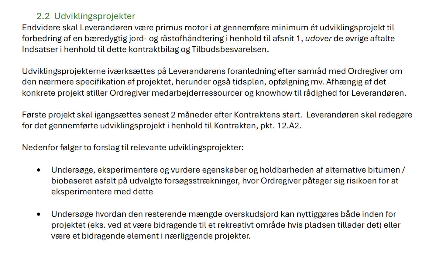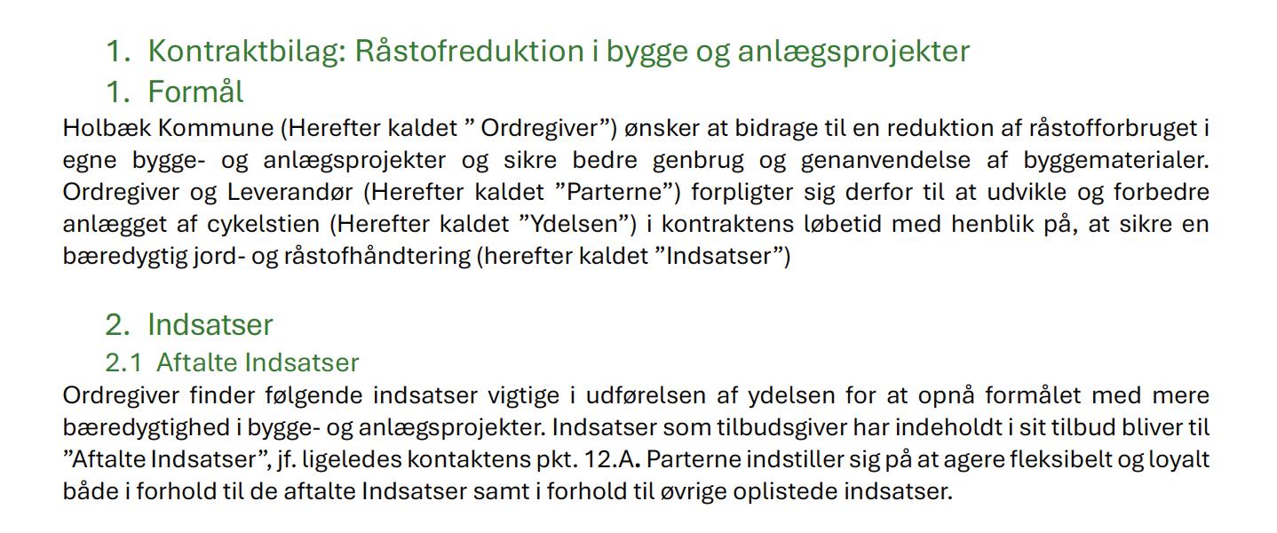 - Redegøre for, hvordan udviklingsprojekterne vil levere resultater i henhold til at leve op til formålet med ordregivers behov for en bæredygtig ydelse i henhold kontraktbilaget: Råstofreduktioner i bygge og anlægsprojekter.