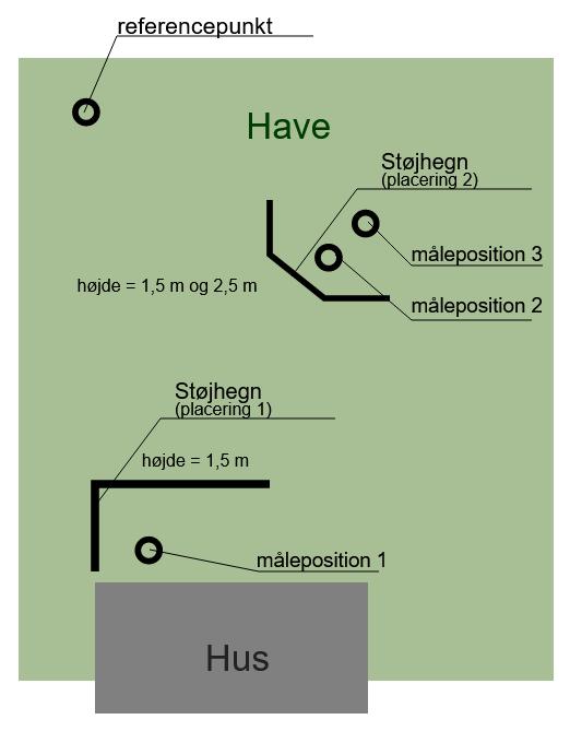 Tre forskellige støjhegnsplaceringer blev afprøvet i denne have, se Figur 2. Støjhegnsplacering 2 og 3 blev afprøvet med to forskellige højder: 1,5 m og 2,5 m. Støjhegnsplaceringerne og målepositionerne er vist i en større udgave i Bilag 6