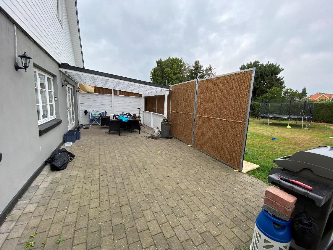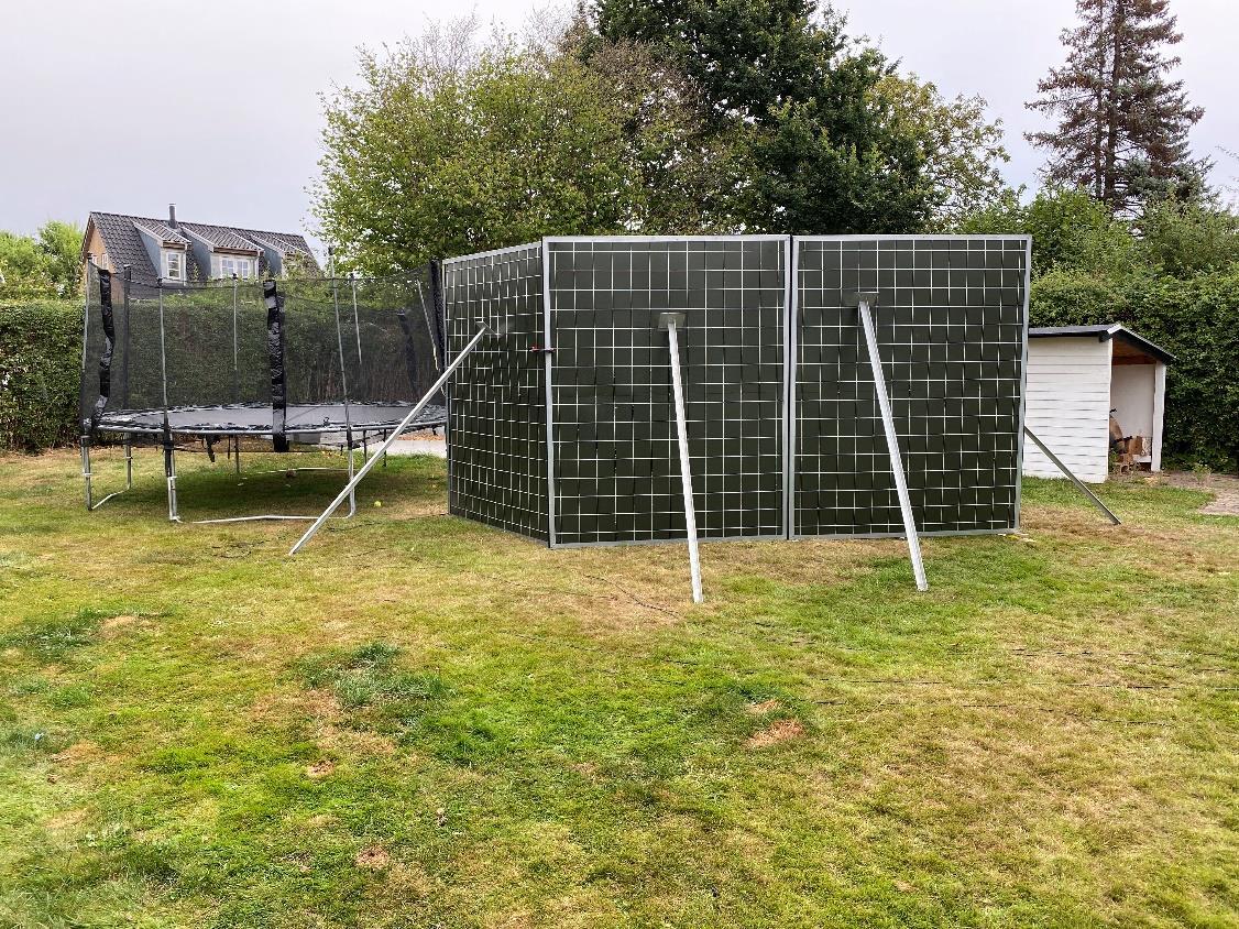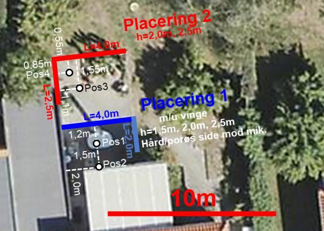 To forskellige støjhegnsplaceringer blev afprøvet i denne have, se Figur 4. Støjhegnsplacering 1 blev opsat og målt både med og uden vinge (vinge markeret med lysere blå farve på Figur 4) og afprøvet i tre forskellige højder: 1,5 m, 2,0 m og 2,5 m Støjhegnsplacering 2 blev afprøvet med to forskellige højder: 2,0 m og 2,5 m. Støjhegnsplaceringerne og målepositionerne er vist i en større udgave i Bilag 6