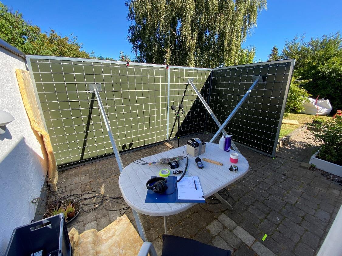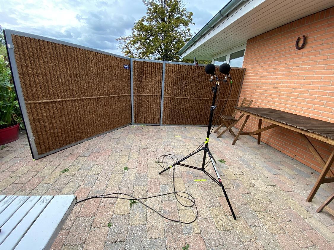 Målingerne foregik med stereomikrofoner i både referencepositionen og i positionerne på terrassen. Ved at måle med stereomikrofoner (som var to omnidirektionale kvalitetsmålemikrofoner placeret med 16 centimeters mellemrum svarende til afstanden mellem ørerne på en voksen person) vil der være mulighed for at foretage naturtro gengivelser af støjen i målepunktet med og uden støjhegn ved at afspille stereosignalet fra optagelserne i kvalitetshovedtelefoner