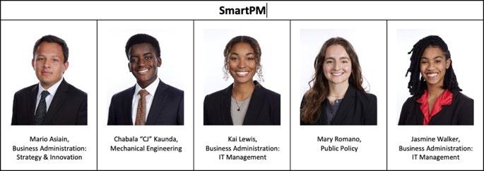 Mary Romano (public policy), Chabala (CJ) Kaunda Jr. (mechanical engineering), Jasmine Walker (business administration: IT management), Kai Lewis (business administration: IT management), and Mario Asiain-Ayala (business administration: strategy & innovation)