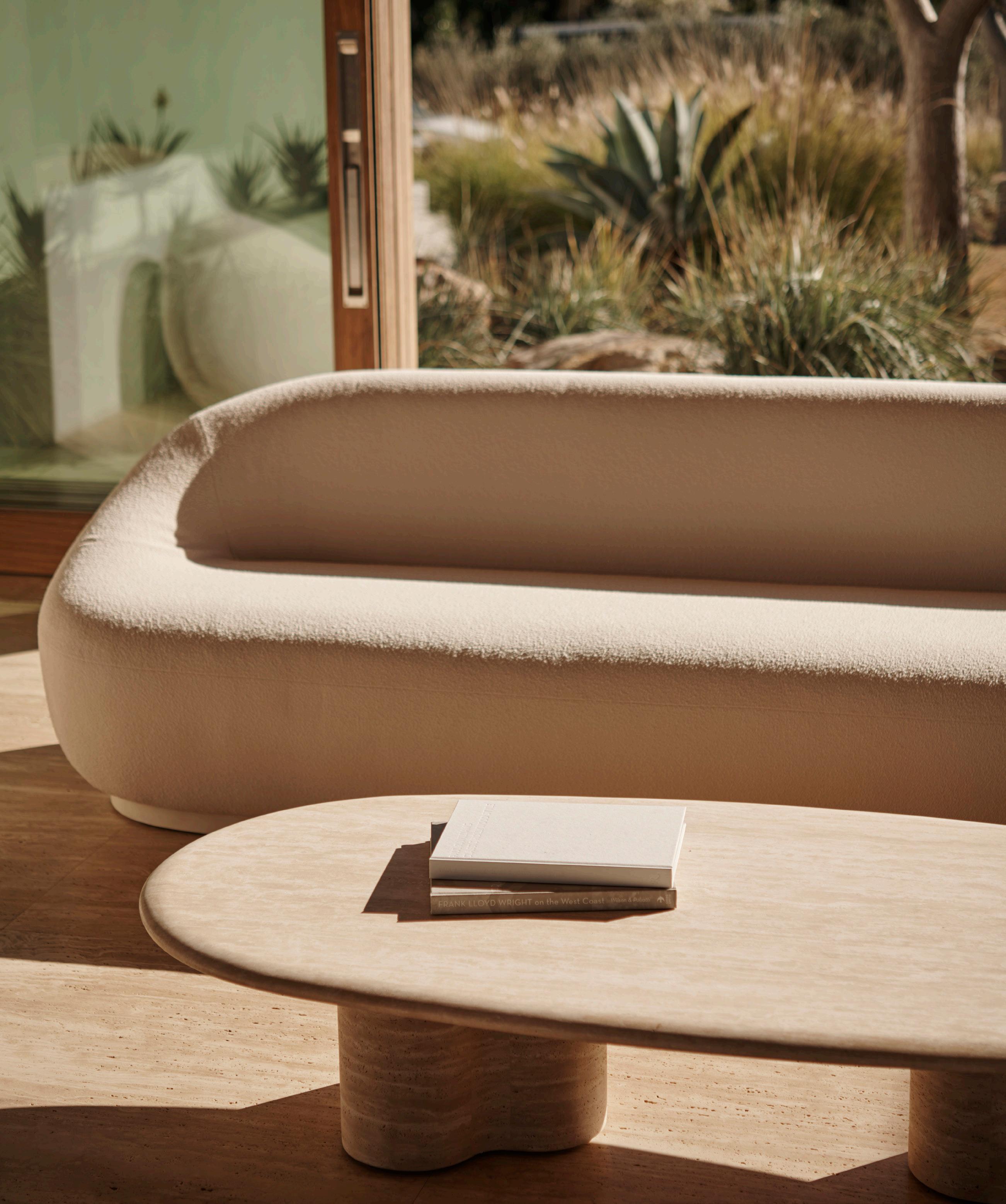 B. Cove Luxe Coffee Table Shown in Travertine Natural and Powder Coated Aluminum Bone.