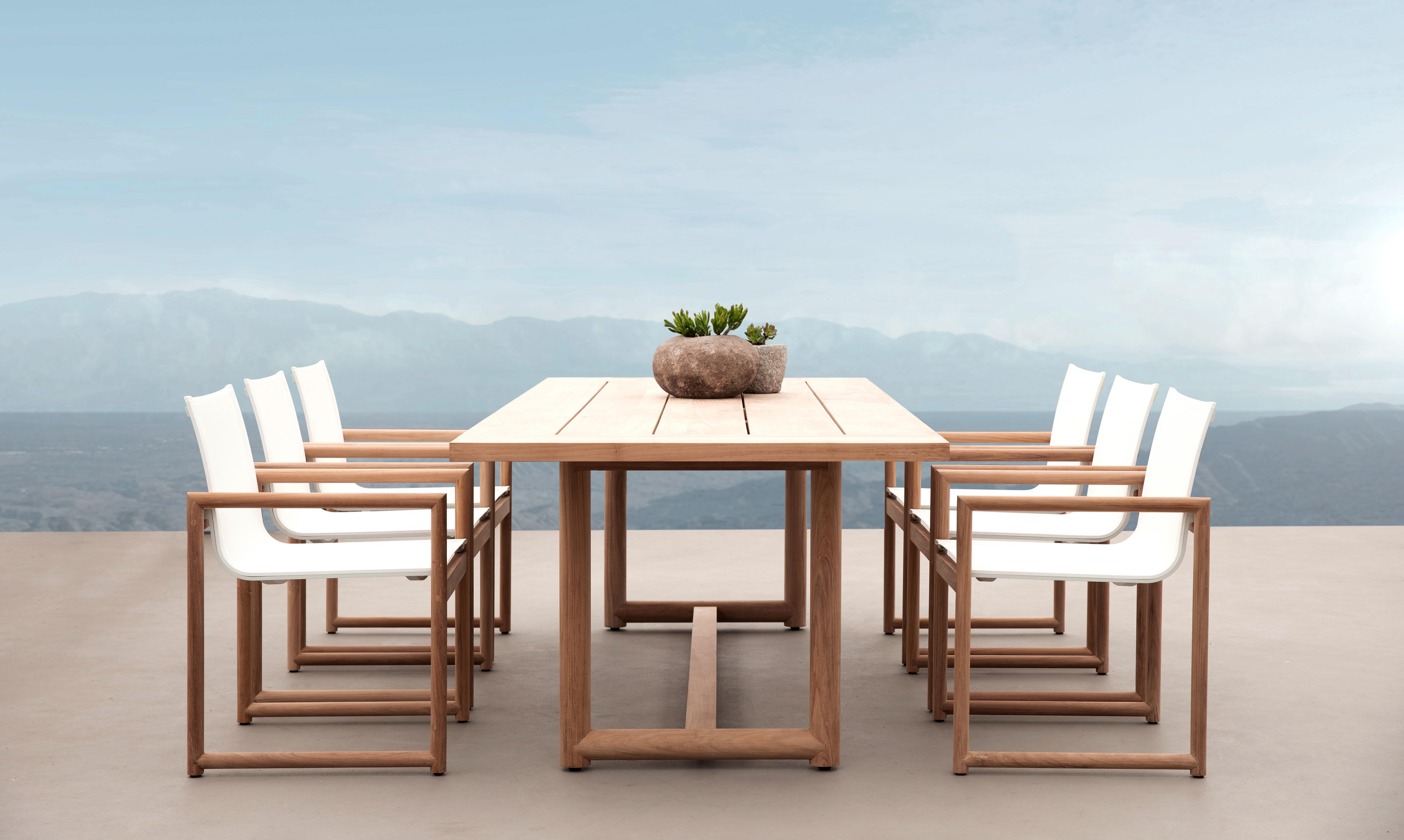 This refined teak collection features special details like double cylindrical legs and curved edges that create soft sculptural silhouettes with understated elegance.