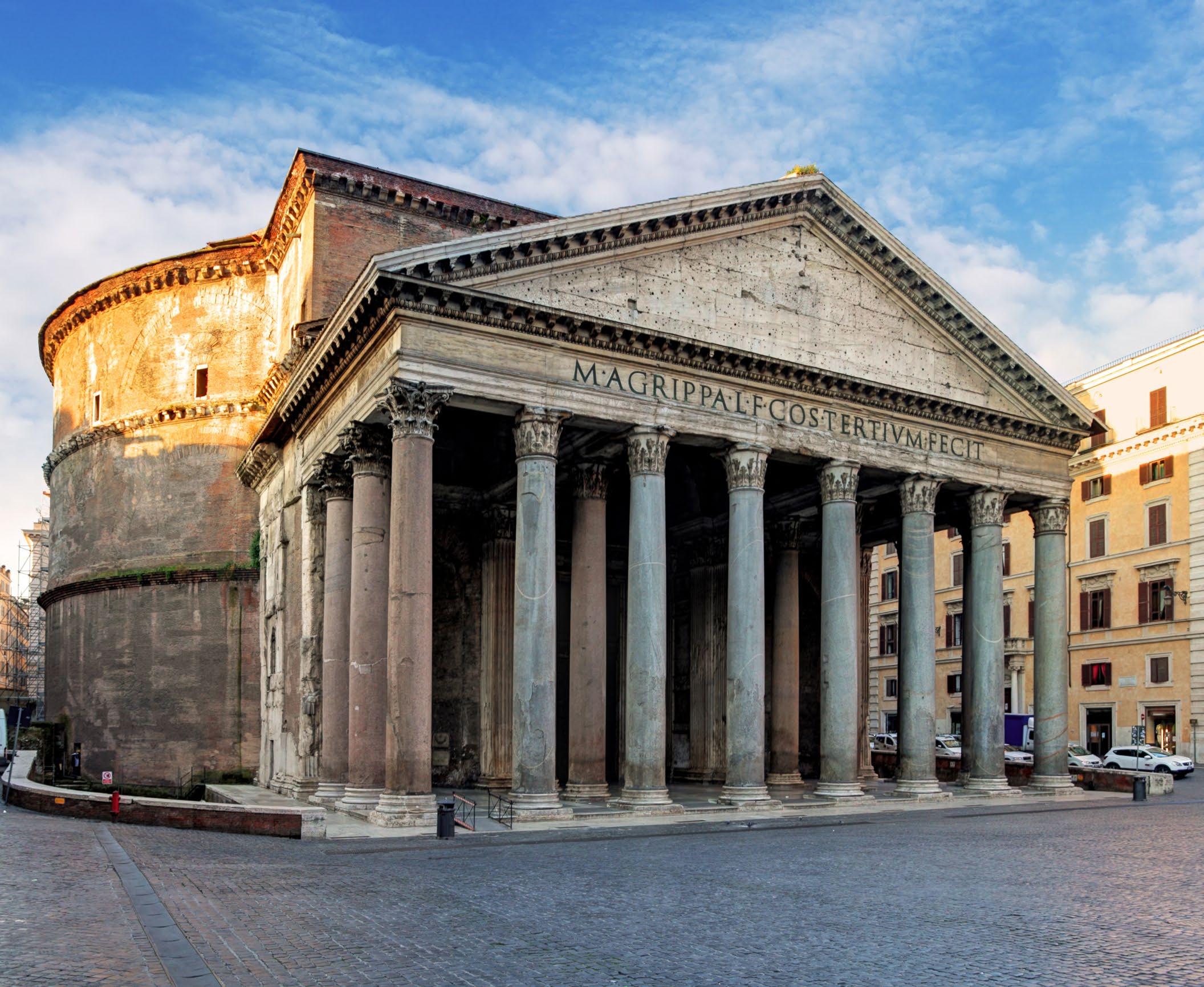 Oggi il Pantheon si trova in pieno centro storico, nell’antico rione Pigna, ma quando venne fondato era il 27 a.C., e fu il genero di Augusto, Marco Vespasiano Agrippa, a voler dedicare un tempio a tutte le divinità, affidando l’incarico della costruzione a Lucio Cocceio Aucto. Il tempio originale fu danneggiato però da due successivi incendi, perciò l’imperatore Adriano lo fece restaurare, tra il 120 e il 124 d.C. E se, dai resti rinvenuti dagli scavi archeologici della fine del 1800 sappiamo che l’edificio originario di età augustea era a pianta rettangolare, fatto di blocchi di travertino rivestiti di lastre di marmo, con capitelli di bronzo e cariatidi e statue sul frontone, la struttura della ricostruzione effettuata nell’epoca di Adriano è invece di forma circolare, quella che conosciamo e ammiriamo ancora oggi, insieme a un portico di colonne corinzie che sorreggono il frontone triangolare. L’iscrizione che ancora oggi leggiamo è quella originaria dell’edificio: “M. AGRIPPA L. F. COS. TERTIUM FECIT”, ovvero “Marco Agrippa, figlio di Lucio, console per la terza volta, edificò”. Una delle particolarità più interessanti della struttura è la grande cella circolare, detta “rotonda”, che conta otto grandi piloni che devono sostenere la grande cupola emisferica, che rappresenta la volta celeste, casa di tutti gli dèi a cui il tempio era dedicato.