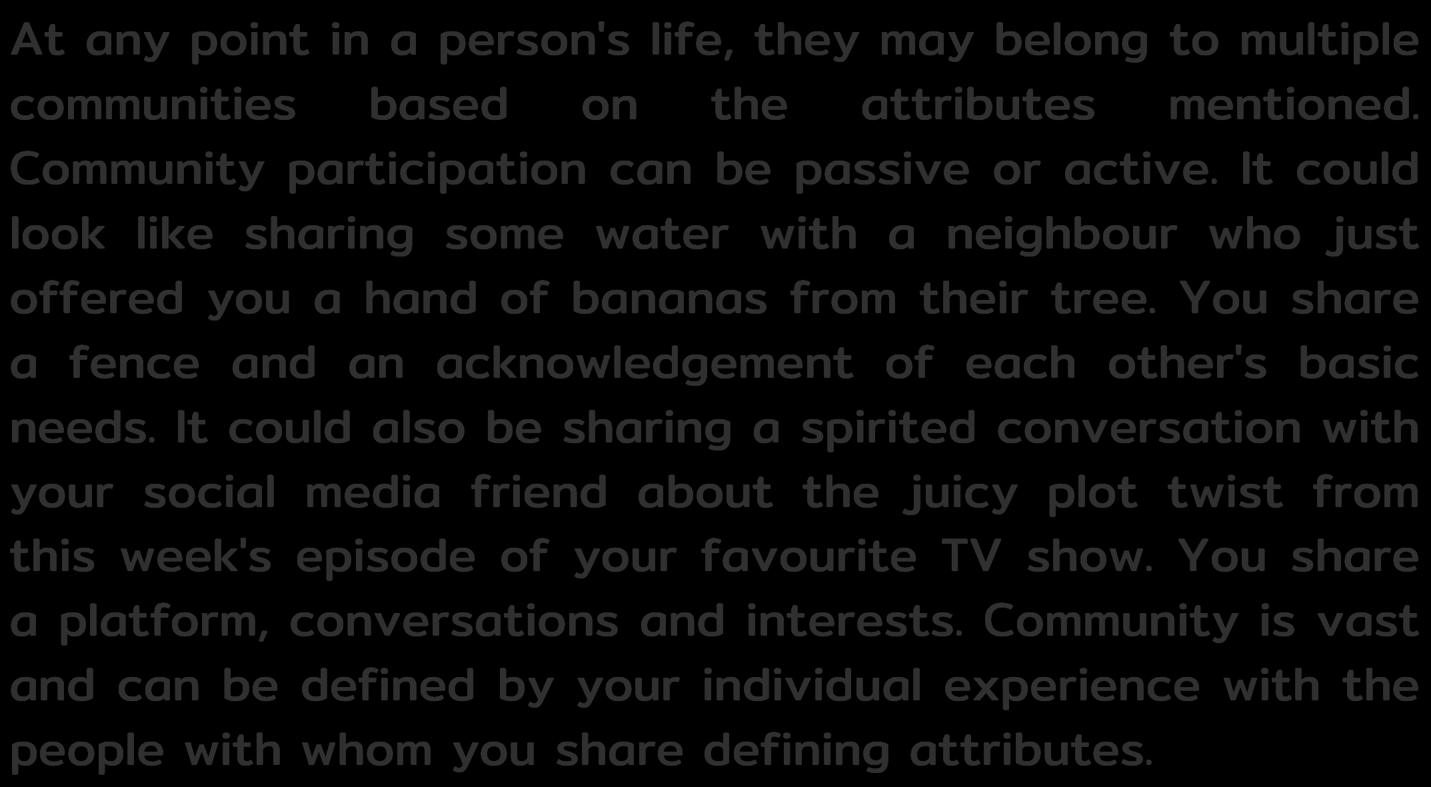 If society is a giant, our If society is a giant, our communities are the communities are the moving parts, we are the moving parts, we are the cells that live, renew, and cells that live, renew, and work together to keep its work together to keep its systemsgoing. systemsgoing.