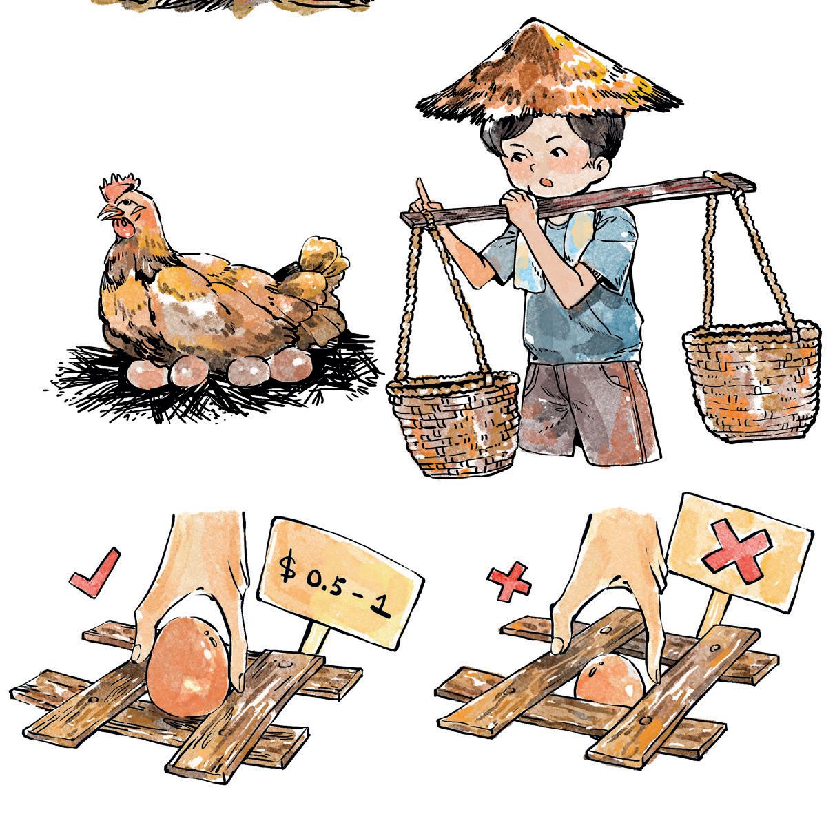 村民用擔挑拿着土產坐船 去沙頭角賣,主要是番薯 芋頭、米,而一支擔挑, 有兩個細籮。
