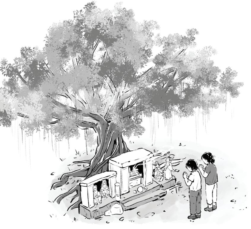 小時候,我的嫲嫲總會在過節的時候帶我到老榕樹下拜 神祈福,祈求神靈的保佑,使我們和下一代子孫能夠健 康地成長,同時也祈求能為農村和家人帶來平安和福 氣。我還記起夏天的時候,谷埔的天氣特別炎熱,我很 喜歡跟一群堂兄弟姐妹和村的小朋友走到榕樹下捉迷藏 或乘涼。由於谷埔欠缺一個兒童遊樂場,所以有些村內 的小朋友也跟我一起設計一些遊樂設施,例如自製遷 秋,我們便利用榕樹的粗壯樹幹承托我們用繩索和木板 製造的遷秋,我們便在該處蕩來蕩去,這樣的消遣方式 讓我們渡過多少個愉快的下午時光。年幼時,除了在老 榕樹處玩耍外,便會到谷埔碼頭海邊處游泳或在谷埔沙 路上踩單車,期間接觸很多不同的動物,昆蟲和植物, 所以我對這些生物的習性認識很深。