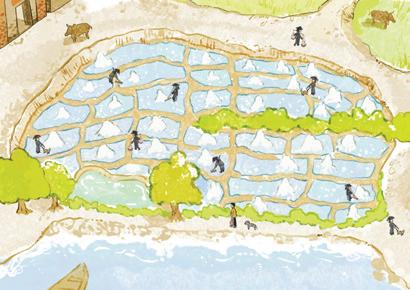 以碌碡令土壤與水充分混合, 使得水田呈泥濘狀,成為適宜 水稻生長的環境。