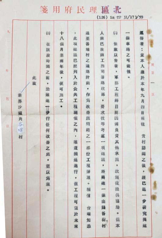 俗,過去多年社會的演變及發展,不少昔日偏遠的新界 地區,交通改善了不少。谷埔目前是極少數交通不便的 村落,現時前往谷埔只可靠水路或者山路才可以到達。 在這種有限交通的設施下,只有氣力充沛的年青人才有 足夠體力往來谷埔與市區。老年人和年幼的人若要前往 谷埔,莫非要他們攀山涉水,用盡九牛二虎之力才能前 往谷埔?現時的交通和行山方法是否可以滿足他們到谷 埔的願望呢?谷埔村内上了年紀的老人即使想回鄉居住 也會因為受到交通問題的限制而卻步。正因為交通需求 或有關問題一直沒有改善,所以我極力建議政府建設由 鹿頸至谷埔的單程公路、單車綠道、行人棧道等,以方 便不同年齡層的市民都可以到達谷埔旅遊或參觀。
