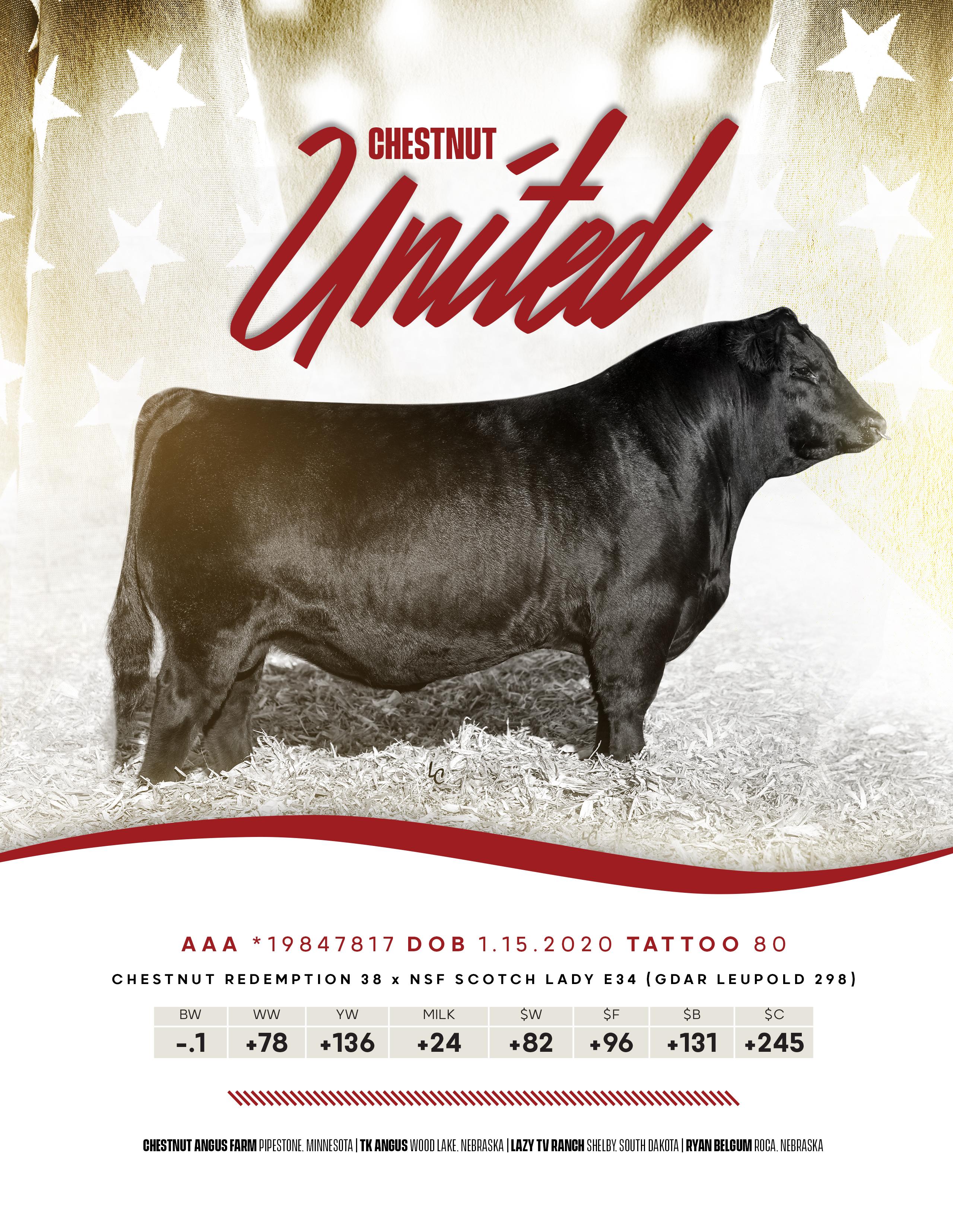 • These sons of Chestnut United have helped cement his position among the most impressive breeding bulls we have ever utilized, let alone raised. The sire group is consistently stouter and denser than the rest, they are impressive in person!