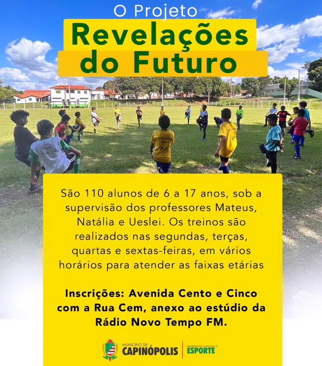Em Capinópolis o esporte acontece! O Projeto Revelações do Futuro de futebol de campo é um sucesso entre a garotada, são 110 alunos que colocam sua energia no esporte, desenvolvendo a cognição e o físico... Os treinos são realizados nas segundas, terças, quar-