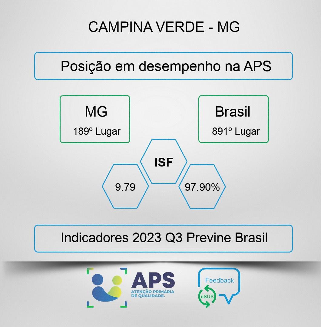 Com grande satisfação, o município de Campina Verde anuncia um marco histórico: a 189ª posição no ranking do Previne Brasil em Minas Gerais e a 891ª no ranking nacional no quadrimestre 2023 Q3.