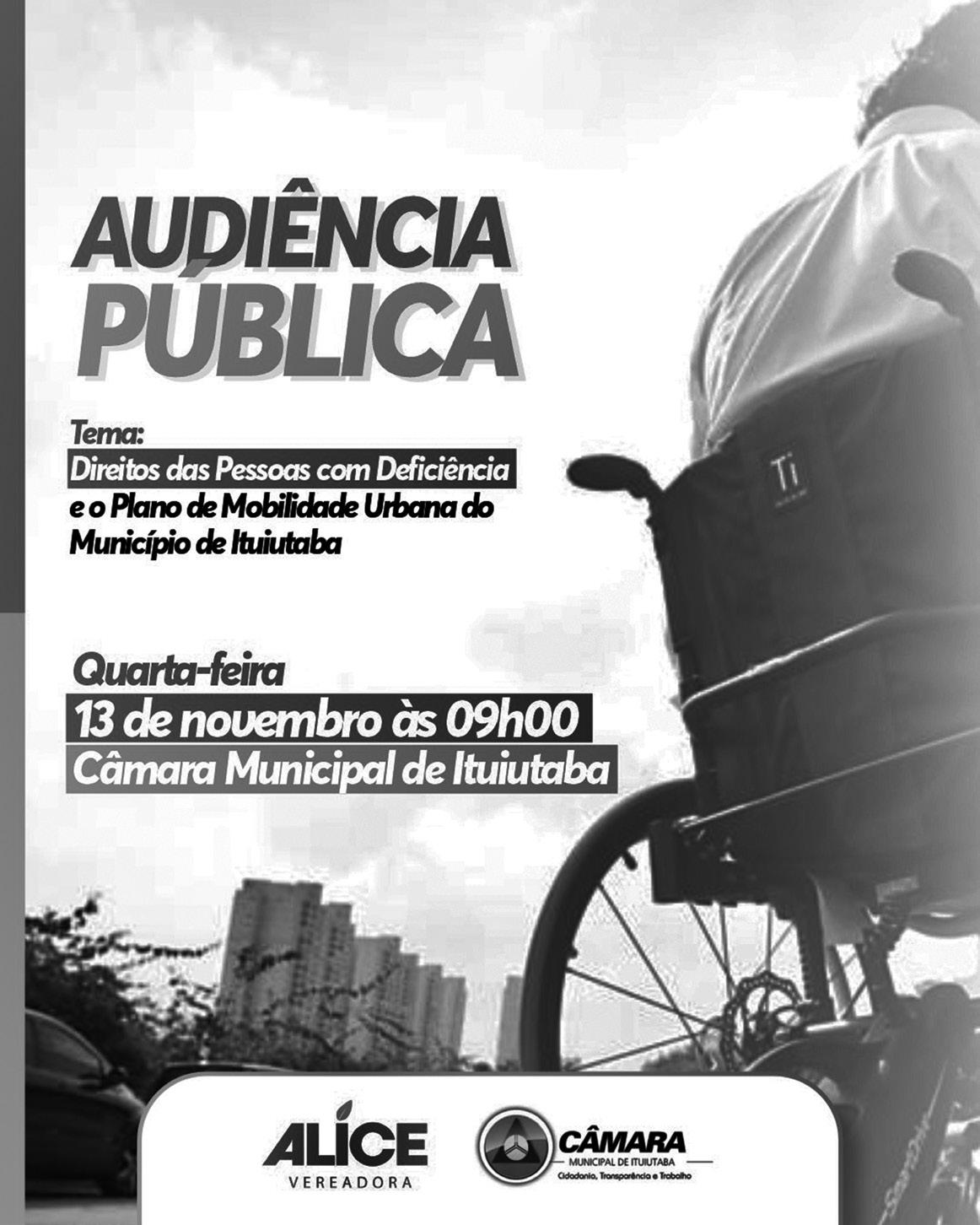 A Vereadora Alice Drummond convida toda a população para a Audiência Pública destinada à promoção e ampliação dos direitos e acessibilidade das Pessoas com Deficiência (PCDs). O evento, que ocorrerá nesta quarta-feira a partir das 9 horas, será realizado no Plenário da Câmara e reunirá representantes de diversas instituições, entidades de apoio e membros da sociedade civil. A audiência tem como objetivo promover um debate construtivo sobre a inclusão e acessibilidade no muni-