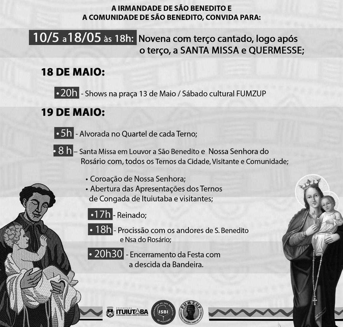 A Irmandade de São Benedito de Ituiutaba (ISBI), com apoio da Prefeitura de Ituiutaba e da Fundação Zumbi dos Palmares (FUMZUP), realizará a Festa do Congado 2024 nos dias 18 e 19 de maio na Praça 13 de Maio.