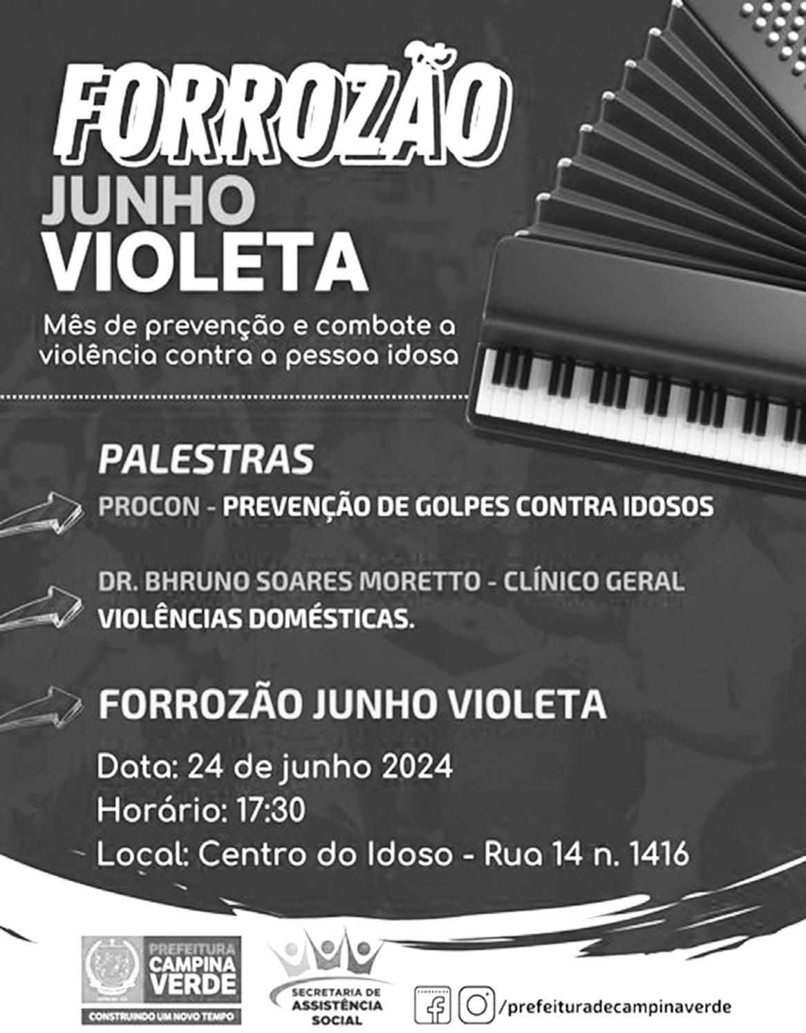 Venha participar da nossa ação especial contra a violência à pessoa idosa. No dia 24 de junho, às 17:30, no Centro do Idoso, teremos uma programação especial: uma palestra com o Procon sobre prevenção de golpes e uma conversa com