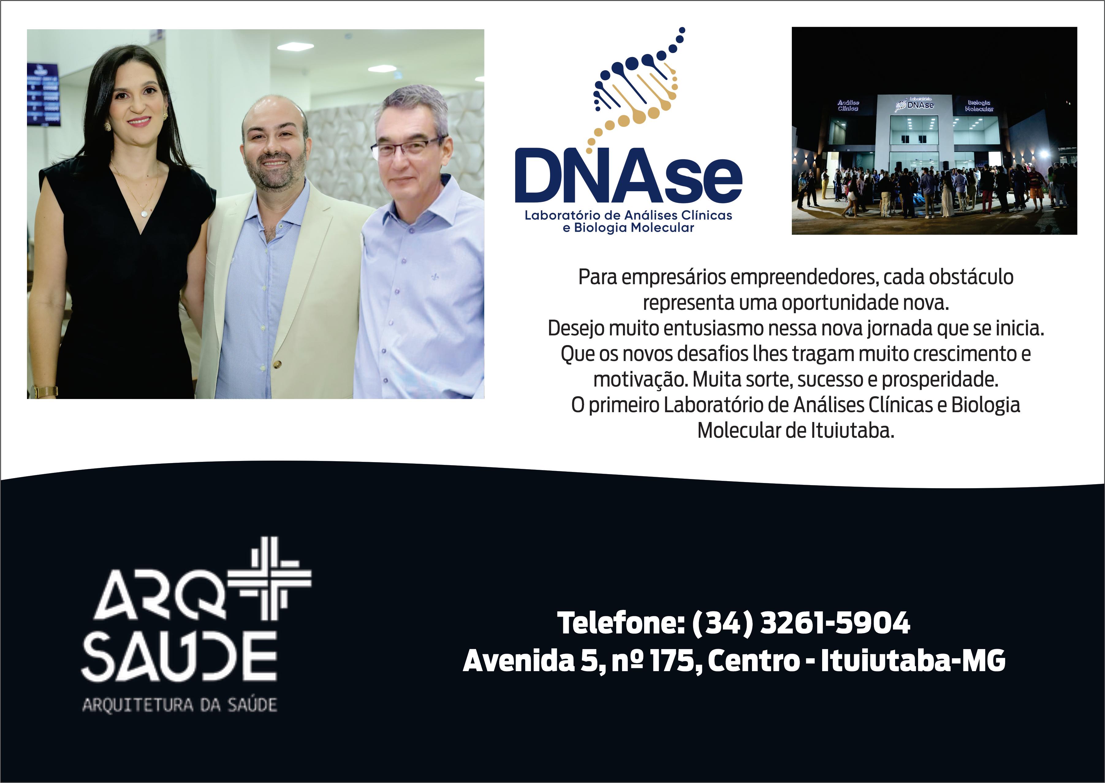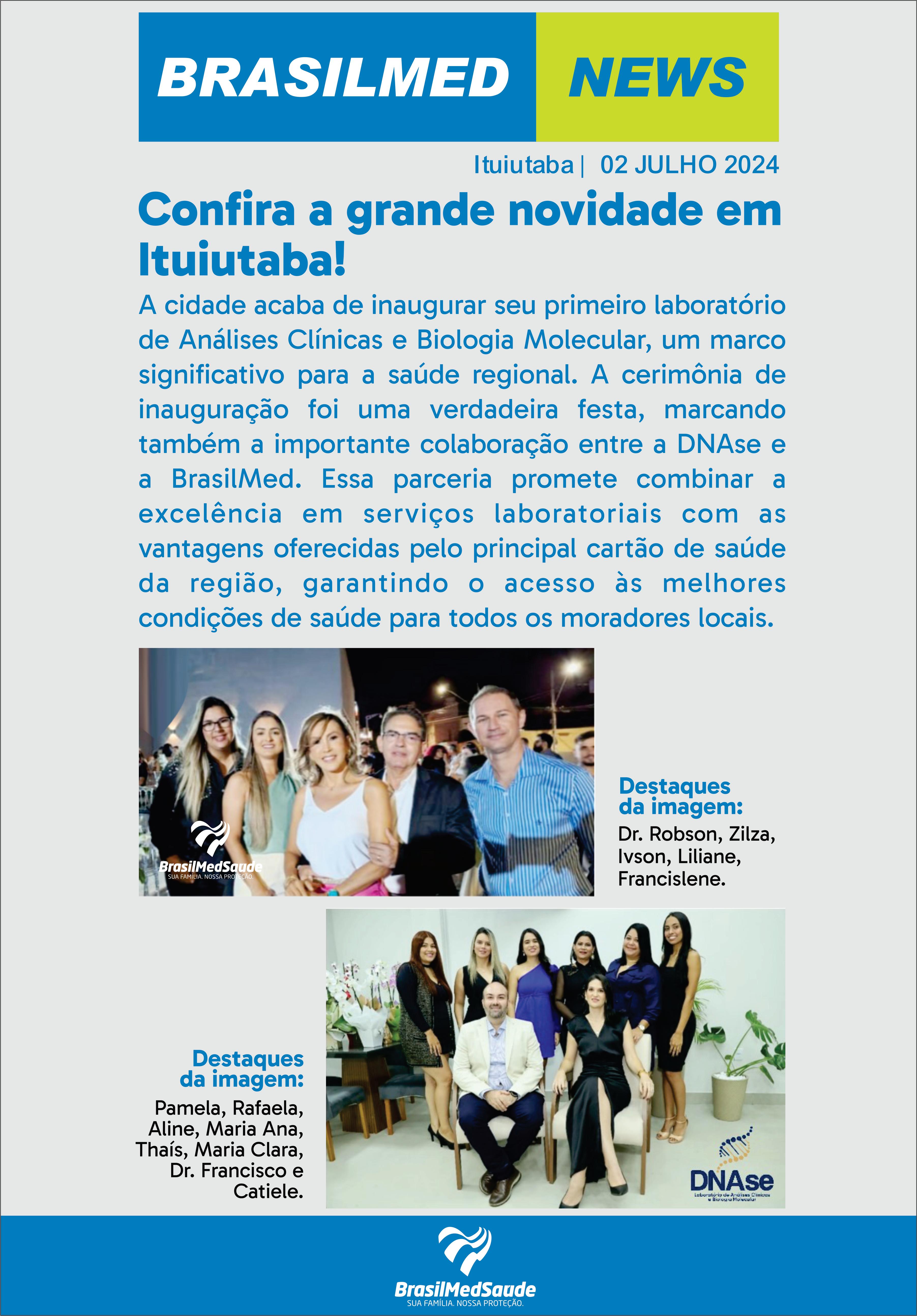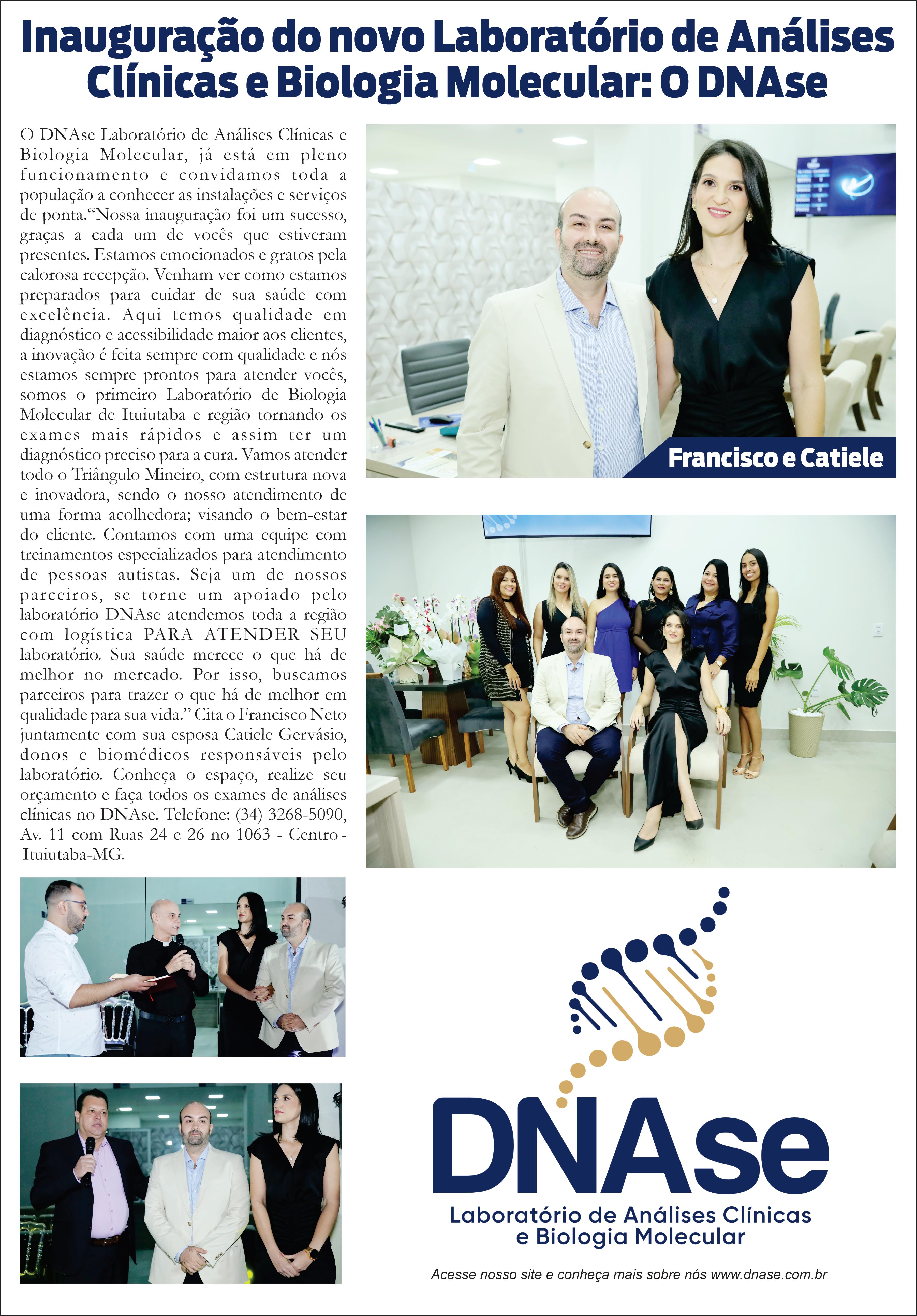 O DNAse Laboratório de Análises Clínicas e Biologia Molecular, já está em pleno funcionamento e convidamos toda a população a conhecer as instalações e serviços de ponta.“Nossa inauguração foi um sucesso, graças a cada um de vocês que estiveram presentes. Estamos emocionados e gratos pela calorosa recepção. Venham ver como estamos preparados para cuidar de sua saúde com excelência. Aqui temos qualidade em diagnóstico e acessibilidade maior aos clientes, a inovação é feita sempre com qualidade e nós estamos sempre prontos para atender vocês, somos o primeiro Laboratório de Biologia Molecular de Ituiutaba e região. Página 02
