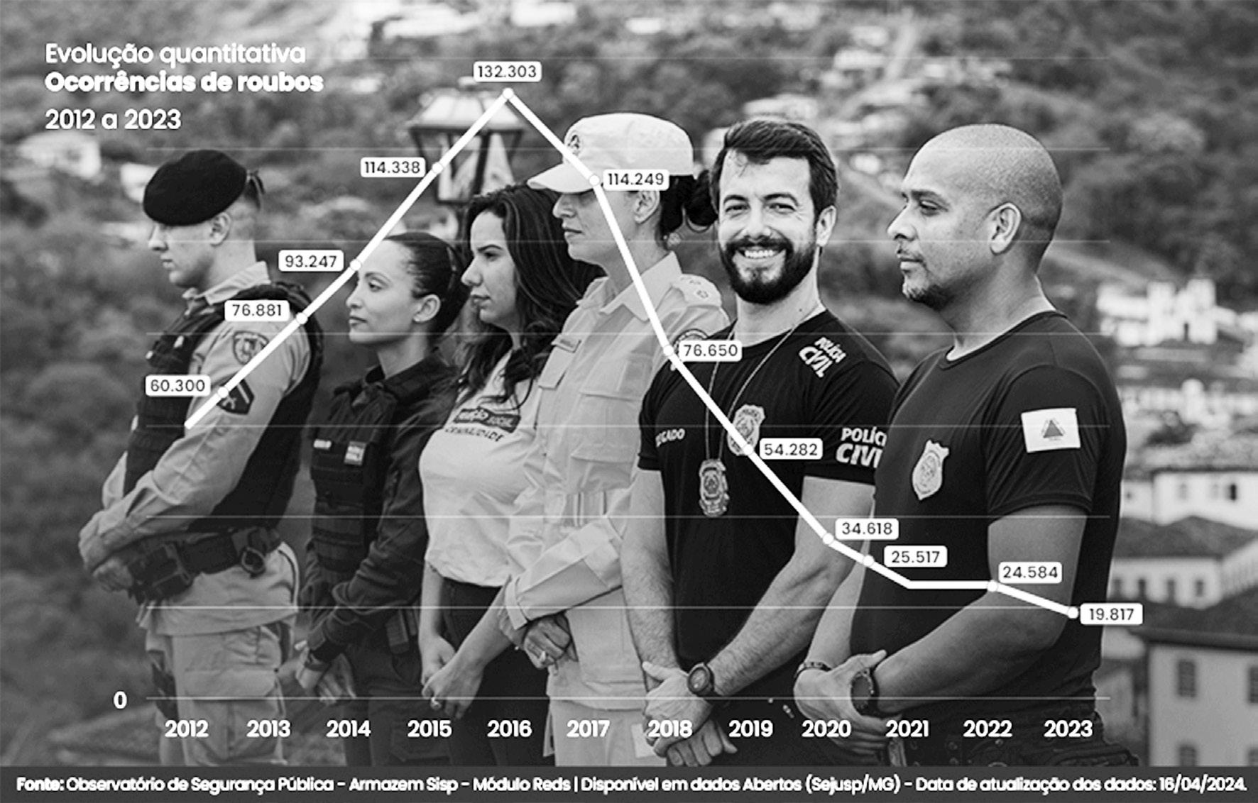 Os roubos caíram 19,4%, alcançando, em 2023, o menor número da atual série histórica de Minas, que passou a ser contabilizada em 2012, com a implantação do Registro de Eventos de Defesa Social (Reds) em todo o estado.