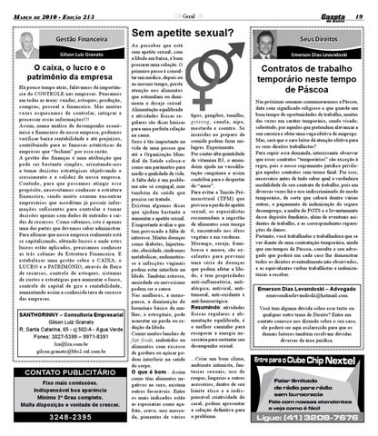 Aumente o Som sexual? Sem apetite Vanelo AoSuelen perceber que Santos está Eliz dos sem apetite sexual, com a libido em baixa, é bom procurar uma solução. O Entendendo o Abstrato primeiro passo é consulGestão Financeira tar um médico, depois ou Pedro da Costa ao mesmo tempo, preste Gilson Luiz Granato atenção nos alimentos que estimulam ou diminuem o desejo sexual. Alimentação equilibrada Gestão Financeira tipos, gengibre, tomilho, e atividades físicas regulares são dicas básicas ginseng, canela, aipo, Luiz Lima e coentro. Se para uma perfeita relação mostarda inseridas no preparo da na cama. Sexo é tão importante na comida podem fazer mivida de uma pessoa que lagres. Experimente. até a Organização Mun- Por conter alta quantidade dial da Saúde coloca-o de vitamina B3, o amencomo um parâmetro para doim ajuda na vasodilamedir a qualidade de vida. tação sanguínea e assim A falta dele é um proble- contribui para o despertar ma não só conjugal, mas do “amor”. também de saúde que Para evitar a Tensão Prémenstrual (TPM) que precisa ser tratado. Existem algumas dicas provoca a perda do apetite que ajudam bastante a sexual, os especialistas aumentar o apetite sexual. recomendam a ingestão É importante avaliar o que de alimentos com ômega tem provocado a falta de 6, encontrado nos óleos interesse. Muitas doenças vegetais e em verduras. como diabetes, hiperten- Morango, cereja, framsão, obesidade, síndromes boesa e amora, são exmetabólicas, endometrio- celentes para prevenir se e infecções vaginais uma série de doenças podem estar interferir na que podem afetar a libilibido. Também estresse, do, e tem propriedades ansiedade ou nervosismo anti-inflamatória, antialérgica, antiviral, antipodem ser a causa. Nas mulheres, a meno- tumoral, anti-oxidante e pausa, a diminuição do anti-hemorrágica. hormônio básico da mu- Resumindo: atividades lher, o estrogênio, pode físicas regulares e aliacarretar na perda ou re- mentação equilibrada, é o melhor caminho para dução da libido. Comer muitos lanches de recuperar a energia nefast foods, embutidos ou cessária para sustentar seu alimentos com excesso desempenho sexual. de gordura ou açúcar podem interferir na saúde ...Criar um bom clima, ambiente intimista, fando corpo. O que é bom - Assim tasias sexuais, uso de como têm alimentos ne- roupas, lingeries e outros gativos ao sexo, existem acessórios, dentro de seu outros favoráveis. Entre limite ético e a indisos mais indicados estão pensável criatividade do as especiarias como aça- casal, podem apresentar frão, cravo, noz mosca- a solução definitiva para da, pimentas de vários o problema.