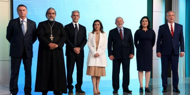 lei eleitoral, foram convida dos os candidatos de parti dos com representação no Congresso Nacional de, no mínimo, cinco parlamen tares, e sem impedimen to na Justiça, seja eleitoral ou comum. Com isso, Ciro Gomes (PDT), Felipe D’Avila (Novo), Jair Bolsonaro (PL), Lula (PT), Padre Kelmon (PTB), Simone Tebet (MDB) e Soraya Thronicke (União Brasil) estiveram presentes.