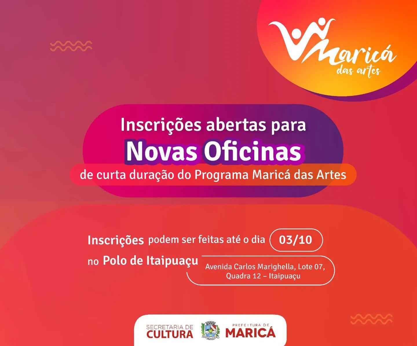 A Prefeitura de Maricá, por meio da Secretaria de Cul tura, está com as inscrições abertas até segunda-feira (03/10), para oficinas gra tuitas de curta duração do Projeto Maricá das Artes, no Polo de Itaipuaçu. Diversas opções estão disponíveis, como fotografia documen tal, direção teatral para inici antes, trompete, violão, con tação de história e mediação de leitura brincando, ukulelê, clarinete, percussão, entre outras.