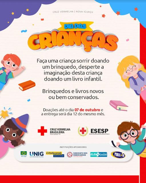Os brinquedos e livros in fantis serão distribuídos em bairros carentes de Nova Iguaçu, no dia 12 de outubro. Alguns parceiros da Cruz Ver melha de Nova Iguaçu estão apoiando a campanha, como o Brasil Sem Alergia, UNIG, Sindicato dos Rodoviários de Nova Iguaçu, MM Saúde e TopShopping.