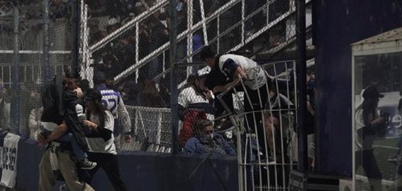 tentar escapar do gás lacrimo gêneo. A partida da primeira divisão argentina foi inter rompida aos nove minutos. O jogador do Gimnasia Leon ardo Morales disse à ESPN: “Meu filho de dois anos não conseguia respirar. Estamos desesperados e preocupa dos com todas as pessoas nas arquibancadas.”