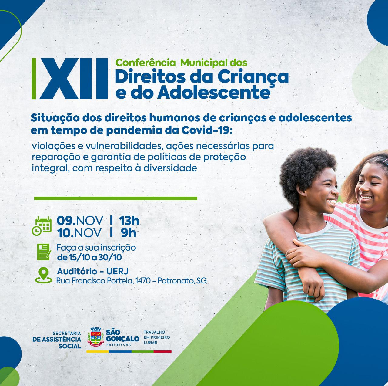 Estão abertas as in scrições para a 12ª Con ferência Municipal dos Direitos da Criança e do Ad olescente, promovida pela Secretaria de Assistência So cial de São Gonçalo, através da Subsecretaria da Infância e da Adolescência em parceria com o Conselho dos Direitos da Criança e do Adolescente. A atividade será nos dias 9 e 10 de novembro, das 13h às 20h e das 8h às 17h, respec tivamente, no auditório da Universidade Estadual do Es tado do Rio de Janeiro (UERJ), polo de São Gonçalo, no Pa tronato. Os interessados po