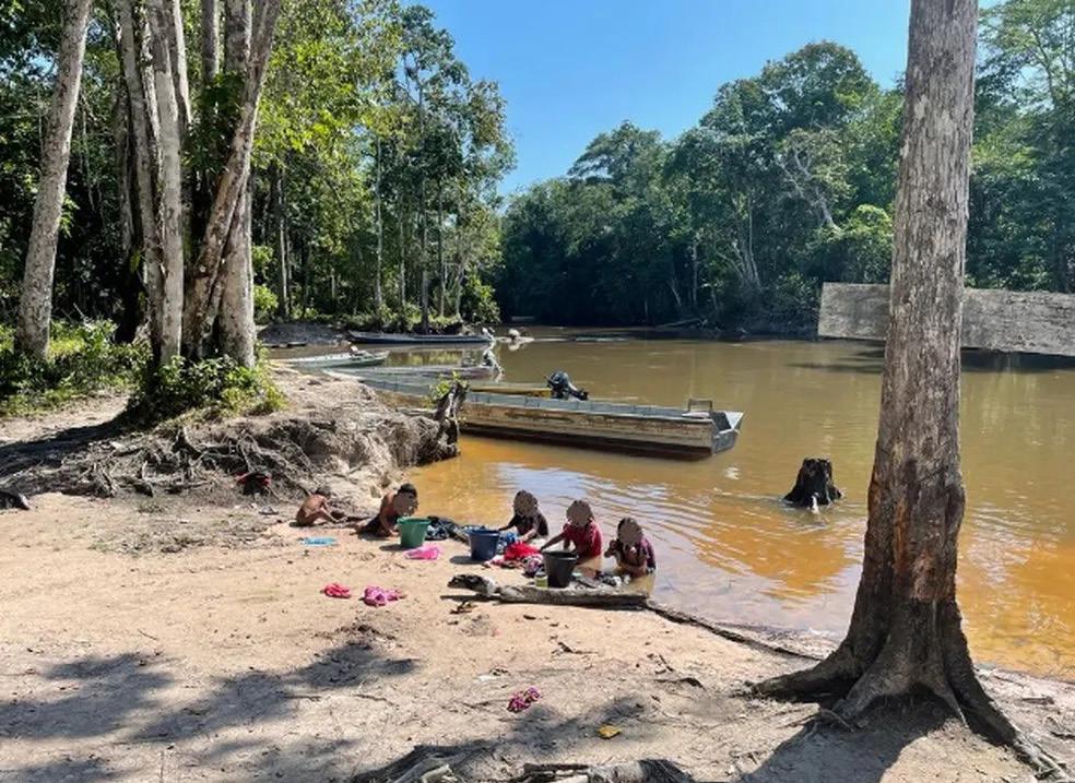 Crianças Munduruku em águas aparentemente contaminadas por rejeitos de mineração ilegal — Foto: Ascom MPF-PA / Divulgação