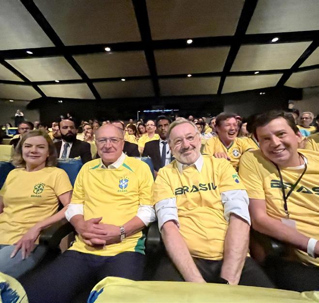 da equipe vestiram a clássica camiseta amarela. Algumas foram customizadas com referências a Lula e ao PT. O evento encheu o teatro do Centro Cultural Banco do Brasil, em Brasília, onde um telão transmite o jogo. Os profissionais da imprensa foram con vidados a assistir, com direito a dis tribuição de pipoca e refrigerante.