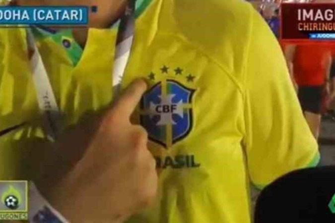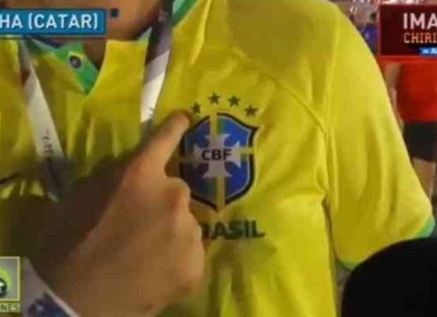 Brasileiro mostra 5 estrelas no peito a repórter no Catar