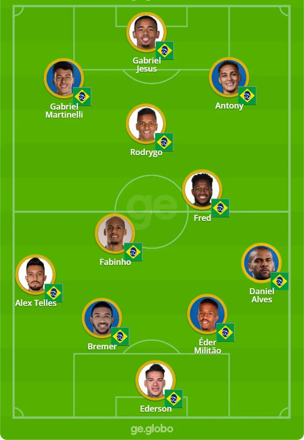Se não houver nenhuma surpresa de última hora, o Brasil vai a campo contra Camarões com: Ederson, Dani Alves, Militão, Bremer e Alex Telles; Fabinho, Fred e Rodrygo; Antony, Gabriel Jesus e Martinelli.