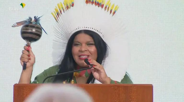 Guajajara tomou posse como Ministra dos Povos Indígenas. A cerimônia aconteceu nesta quarta-feira (11) em Brasília, no Palácio do Planalto, em conjunto com a posse de Anielle Franco, Ministra da igualdade Racial. Em uma cerimônia histórica Sonia começou seu discurso lembrando de suas origens e exaltando o seu povo e todos os povos indígenas: “Eu não estou aqui sozinha, estou aqui com a força da nossa ancestralidade. Trabalhei como babá e empregada doméstica e hoje estou aqui nomeada para o cargo de ministra dos povos indígenas. Se estou aqui hoje é graças a força do meu povo, dos povos indígenas do Brasil e a minha persistência“, disse a ministra Por questões de segurança e limitação do espaço, o evento foi apenas para convidados, mas transmitido de forma online nos canais oficiais das ministras.