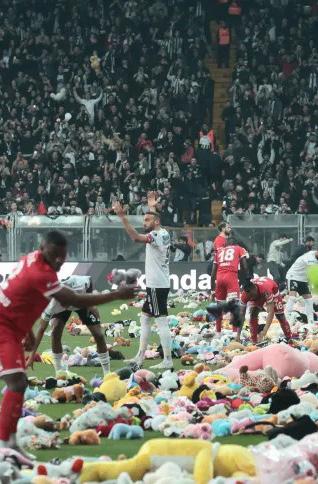 Os torcedores do Besiktas, da Turquia, jogaram milhares de brinquedos de pelúcia no campo durante a partida do domingo (26) contra o Antalyaspor, para serem doados as crianças afetadas pelo terremoto no país, que também atingiu a Síria.