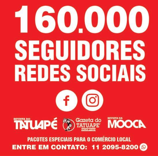 ´ LOCAÇÃO SALAS AV DR EDUARDO COTHING 4 salas cada uma com 10 m², 2 wcs, R$ 800,00 cada sala, REF 605 SOBRADO TATUAPÉ NOVO 142 m², 3 dorms, 1 st, sacada gourmet, 2 vagas, R$ 5.500,00, REF: S479 SOBRADO PROX EMILIA MARENGO 3 suites, 180 m², 2 vagas, lavabo, sacada, R$ 5.000,00, REF: S478 COMERIAL RUA CANTAGALO 3 dorms, 2 salas, 1 vaga, 3 wcs, R$ 3.200,00 + IPTU RUA APUCARANA Sobrado Amplo, 1 vg, 2 dorms, 3 wcs + 1 quartinho, R$ 3.800,00, REF: S476 COMERCIAL VILA FORMOSA Altos , 4 salas + recepção e 2 wcs, R$ 4.000,00, REF: 605 SALÃO COMERCIAL RUA CAÇAQUERA Sobreloja, 300 m², 3 wcs, R$ 4.500,00, REF: 602 HORÁRIO DE FUNCIONAMENTO DE SEGUNDA A SEXTA DAS 09:00H AS 16:00H APTO PROX METRO TATUAPÉ 71 m², 3 dorms sendo 1 st, arms, 1 vaga, lz comp, R$ 3.300,00 + encargos, REF: A249 CASA TATUAPÉ 3 dorms, sala, coz, wc, sem vaga, R$ 1.900,00 160. 000 TERRENO TATUAPÉ 7,5 X 34 R$ 890 MIL 3 dormitórios, 5 vagas, excelente local, REF: 5182 @GAZETADOTATUAPE BOLSA DE EMPREGOS M CM CY K EstamosAdmitindo_11,7x9cm.pdf 1 29/03/2023 17:51:05 BALANÇOS, ATAS E EDITAIS? AQUI É LEGAL! Informe-se: (11) 2095-8200 comunicados negócios & oportunidades imóveis alugam-se VIU? ANUNCIANDO TODO MUNDO VÊ! TEL.: 11 2095-8200 SÃO PAULO, 2 DE ABRIL DE 2023