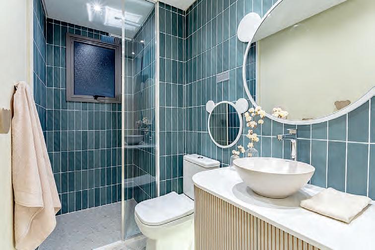 desenhados pelo escritório de Joel Abrão a partir da junção da verticalidade da torre com a horizontalidade proporcionada pela ampla frente do lote. Segundo Joel, “a união desses dois pontos se dá pelo cubo em pele de vidro, que marca oacesso de pedestres, tornando o conjunto visivelmente harmônico. A implantação do residencial de 23 andares no terreno buscou valorizar a experiência do pedestre, onde oalargamento da calçada e o paisagismo favorecem a circulação, iluminação e sensação de bem-estar”, declara o renomado arquiteto. O projeto de decoração de interiores desenvolvido pelo escritório Cristina Barbara é “sofisticado, exclusivo e muito bem projetado é o apartamento do Vitrine Tatuapé de 103 metros quadrados, que sobressai pela sua planta de três suítes, lavabo e pelo seu grande living que abriga uma sala de jantar de oito lugares”, declara a designer.