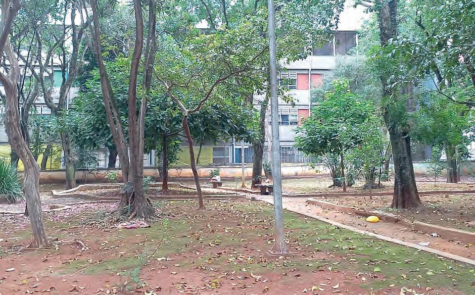 das calçadas e alamedas é totalmente irregular e também faltam rampas para quem usa cadeiras de rodas. Do mesmo modo, alguns pontos do calçamento estão cobertos por limo, o que vem causando a queda de pedestres. A praça deveria ser um ponto de descanso, convivência e contemplação. Porém, a Prefeitura optou por praticamente não instalar mesas e bancos. As espécies arbóreas estão em terra batida, sem nenhuma grama ao redor. Quando o assunto são flores, é quase impossível ver uma sequer. O terreno apresenta, ainda, demandas nas áreas sociais e de saúde. A princípio pelo número de ocupantes em situação de vulnerabilidade. Sobretudo porque eles constroem barracos de madeira, armam barracas de
