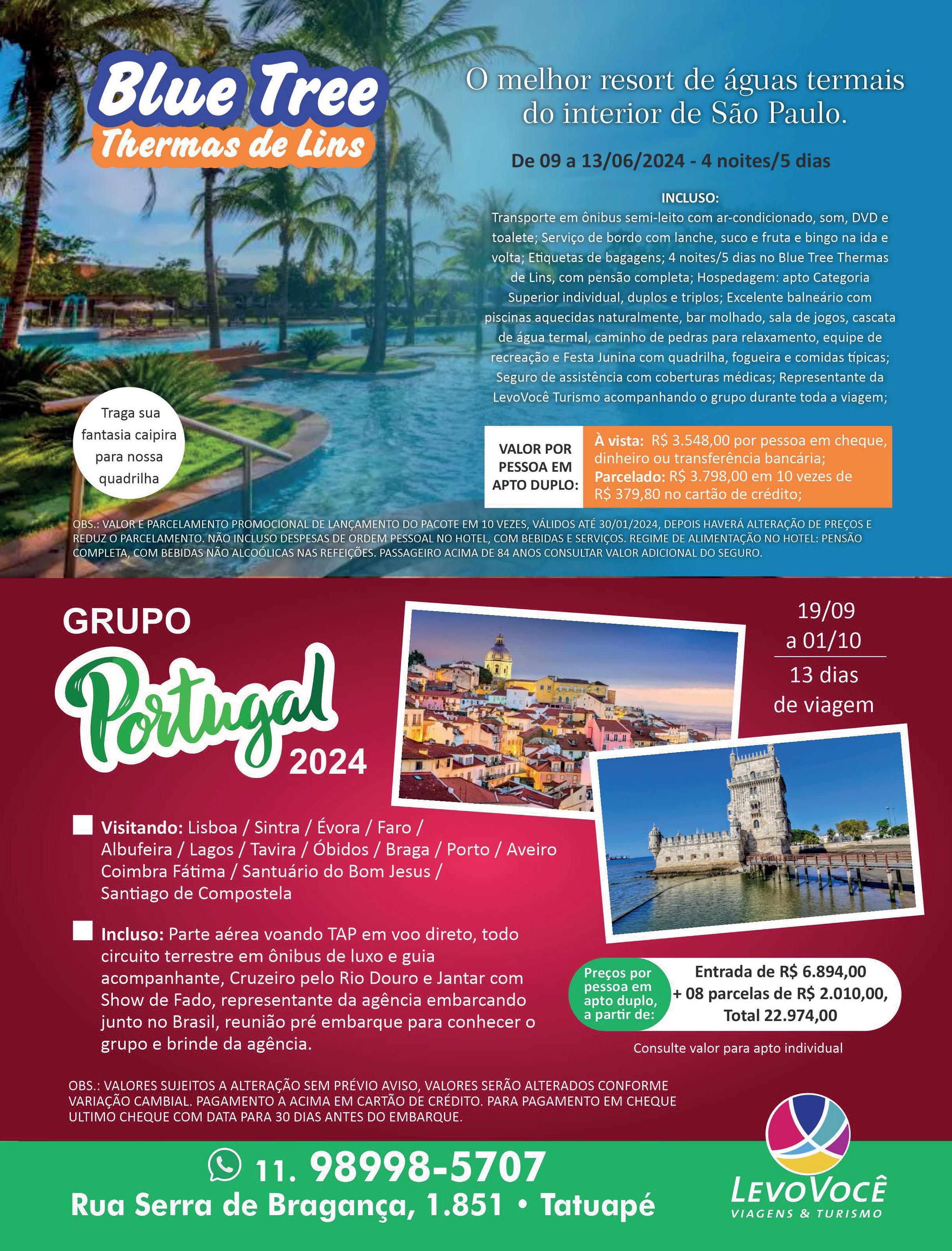 A LevoVocê Viagens & Turismo, que está há 17 anos no mercado do turismo, com sede própria, localizada no Tatuapé, tem o pacote ideal para você conhecer ou reviver as maravilhas de Portugal. Serão treze dias de viagem, voando TAP em voo direto, de 19 de setembro próximo a 1º de outubro, com passeio em Santiago de Compostela, na Espanha.
