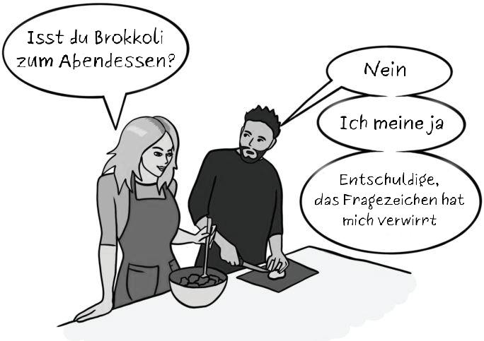 Der Ehemann hat sich mit seiner Frau gestritten. Sie sprachen nicht miteinander, also hinterließ er am Abend eine Notiz auf dem Tisch. „Weck mich morgen um 6 auf.” Am nächsten Tag wacht er auf, schaut auf seine Uhr, es ist fast 10. Er springt aus dem Bett, wirft einen Blick auf den Nachttisch, da liegt ein Zettel von seiner Frau. „Steh auf, es ist schon 6.”