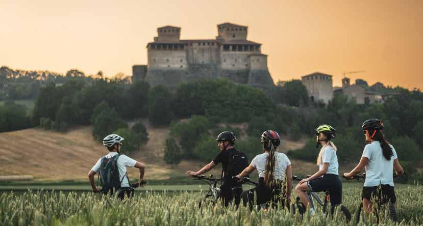 sui vicoli del paesino e sui vigneti. Dopo il Covid Leonardi non dispera e fa tris, con la Bottega del Borgo che, ricavata in un vecchio magazzino, oggi accoglie tutti: tavoloni di legno, il profumo buono di un tempo e nel piatto, dal venerdì alla domenica, salumi, formaggi, torte salate e leccornie a km zero: “Vini compresi”, spiega Leonardi, ”Malvasia, Sangiovese, Lambrusco: abbiamo scelto di servire solo bottiglie locali perché ormai anche le nostre etichette sono “nobili” quanto prosciutto e parmigiano”. Il borgo vive grazie a chi come lui ha sempre creduto nella fiaba. In fondo il castello è uno scenario perfetto: intorno, sulla collina dove corrono le antiche vie di pellegrini e linari ci sono cerbiatti, daini proprio come nelle sale affrescate del castello, “Pure i lupi, adesso”, scherza Leonardi che della manutenzione dei sentieri ha fatto un’arte paziente e costante. Al racconto non manca nulla se non lo sprint di un cambio turbo con la bici elettrica: “Il noleggio è stata la nostra prima attivi-