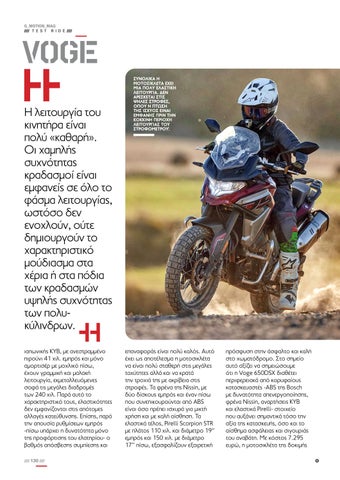 VOGE Η λειτουργία του κινητήρα είναι πολύ «καθαρή». Οι χαμηλής συχνότητας κραδασμοί είναι εμφανείς σε όλο το φάσμα λειτουργίας, ωστόσο δεν ενοχλούν, ούτε δημιουργούν το χαρακτηριστικό μούδιασμα στα χέρια ή στα πόδια των κραδασμών υψηλής συχνότητας των πολυκύλινδρων. ιαπωνικής KYB, με ανεστραμμένο πιρούνι 41 χιλ. εμπρός και μόνο αμορτισέρ με μοχλικό πίσω, έχουν γραμμική και μαλακή λειτουργία, εκμεταλλευόμενες σοφά τις μεγάλες διαδρομές των 240 χιλ. Παρά αυτό το χαρακτηριστικό τους, ελαστικότητες δεν εμφανίζονται στις απότομες αλλαγές κατεύθυνσης. Επίσης, παρά την απουσία ρυθμίσεων εμπρός -πίσω υπάρχει η δυνατότητα μόνο της προφόρτισης του ελατηρίου- ο βαθμός απόσβεσης συμπίεσης και //// 130 ////