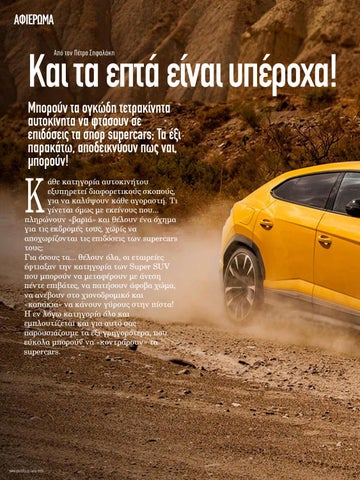 άθε κατηγορία αυτοκινήτου εξυπηρετεί διαφορετικούς σκοπούς, για να καλύψουν κάθε αγοραστή. Τι γίνεται όµως µε εκείνους που... πληρώνουν «βαριά» και θέλουν ένα όχηµα για τις εκδροµές τους, χωρίς να αποχωρίζονται τις επιδόσεις των supercars τους; Για όσους τα... θέλουν όλα, οι εταιρείες έφτιαξαν την κατηγορία των Super SUV που µπορούν να µεταφέρουν µε άνεση πέντε επιβάτες, να πατήσουν άφοβα χώµα, να ανέβουν στο χιονοδροµικό και «καπάκια» να κάνουν γύρους στην πίστα! Η εν λόγω κατηγορία όλο και εµπλουτίζεται και για αυτό σας παρουσιάζουµε τα έξι γρηγορότερα, που εύκολα µπορούν να «κοντράρουν» τα supercars.